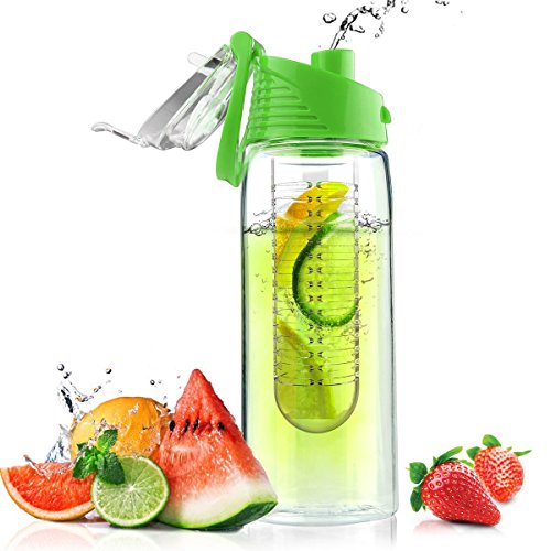 Is water getting a little boring? The Pure Fruit Flavour 2 Go Water Infuser Bottle lets you add a fruity splash by flavoring it with the fruit infuser. Revolutionary high tech material is extremely impact resistant and 100-percent BPA free. This infuser bottle withstands subfreezing to boiling temperatures. Just add a variety of fruits or vegetables to the water for a refreshing drink that'll keep you hydrated and saying goodbye to bottled water. Add lemons, limes, strawberries, cucumbers, apples or even fresh mint to the infuser bottle. Dishwasher safe. Avoid using cleaners containing chlorine or bleach. Clean with non-abrasive sponge or cloth. Do not freeze or microwave. Ideal for the gym, office, school, travel or the outdoors.