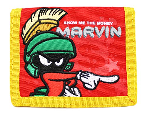 -. Binding : Apparel -. Brand : Marvin the Martian -. ClothingSize : tri-fold -. Color : Multicolored -. Department : boys -. EAN : 0768674444529 -. Feature : Marvin the Martian tri-fold wallet / Features a transparent ID sleeve, two card holders, and a zippered pouch / Uses velcro to stay closed / Officially licensed product / Measures 4.5in (11.5cm) long and 3.5in (9cm) tall -. ProductGroup : Apparel -. ProductTypeName : ACCESSORY -. Size : tri-fold -. Title : Marvin the Martian Show Me the Money Kids Tri-Fold Wallet -. UPC : 768674444529