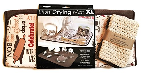 -. Title : The Original Dish Drying Mat, Mesh Microfiber in Typography, Cooking with Love, XL with Hand-made Dish Cloths