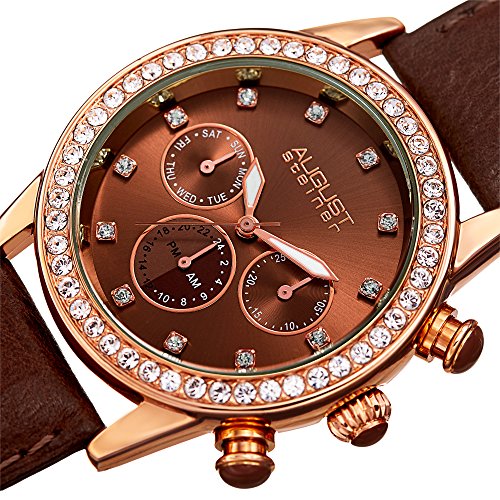 August Steiner Swarovski Crystal Studded Women’s Watch With Casual Genuine Leather Bracelet Strap, Sunray Dial and Multifunction Day, Date and AM/PM – Swiss Quartz