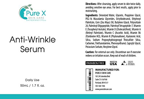 ANTI WRINKLE SERUM is an Anti Aging gel with a Special Blend of Oil extracts and essential vitamins. It contains your daily treatment of important vitamins including Vitamin C Ascorbic acid Vitamin E Vitamin D Vitamin A Vitamin B6 and Vitamin K. Formulation includes a healthy dose of Hyaluronic Acid that revitalizes and repairs skin. Also contains PEG-16 Macadamia Glycerides the active ingredient in Macadamia Seed Oil.