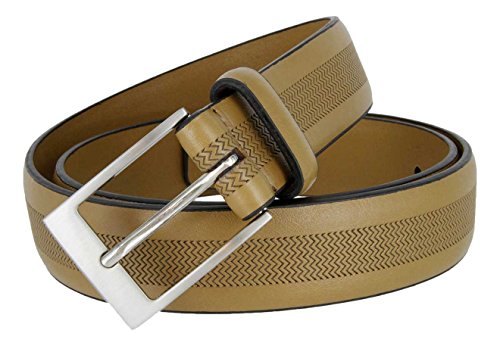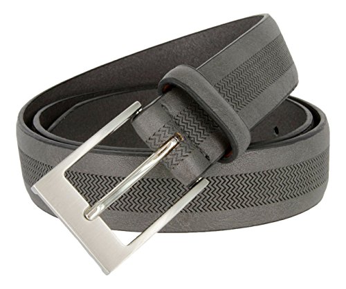 Product Description Genuine Leather Casual Belt for Men. Contemporary Wave pattern down the Center. Solid metal buckle with Matching Color Backing and Leather Keeper. Measure around where you wear the belt and order that size.