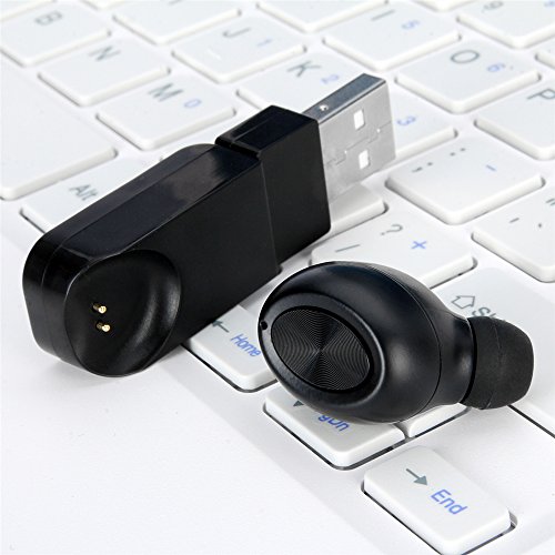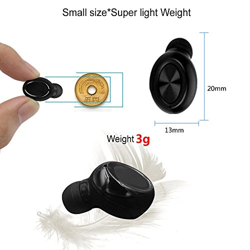 -. Feature : Stay in your Ear,Comfortable: Earplugs feel so light and natural, you almost do not notice it is there. Ergonomic design, ear-shaped shape can be safely kept in your ear, do not fall easily, fit left ear or right ear. / Magnetic Inductive Charging, easy and fast: With a magnet built inside the charger, earbud magnetically sticks to the charging prongs - no pling/unpling needed. No more fiddling around with cables or cords. Quick charging time: 0.5H. / Loud and clear voice: Only with a comfort and secure fit will you enjoy a powerful sound. Coming our clear,crisp sound for Music,audiobooks,podcasts and handsfree calls / Mini Invisible Earbud: Compact and lightweight only 0.16oz; One Button Design Easy to Answer the call, ISSC Bluetooth 4.1 Technology ensures fast transmission speed; built in HD and sensitivity microphone with clear sound, ideal for in-car calling or stealth listening or watching at work or in the office,music play and so on while driving without any mess. / Longer Music/Talk Time: this Mini wireless earpiece with built-in rechargeable lithium-poly 50mAh battery, last for 6 hours of audio playtime under 60% volume, 7 hours talk time, 0.5-1 hours charging time(Only one earpiece)