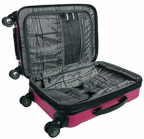 -. Feature : Stylish and innovative design is constructed with lightweight and durable ABS exterior with molded corner reinforcement for maximum impack resistance / Expansion zipper on main compartment allows for extra carrying capacity when needed / Garment restraint / Lid includes a large mesh u-shaped zipper pocket with elastic top shoe/accessory pockets and a mesh zipper pocket / Durable bottom grab handle and flexible top and side handles allows for easy lifting