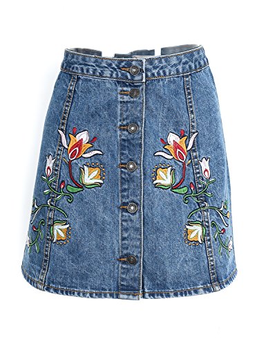 -. Feature : Made of quality denim material, light and soft, please cold hand wash and lay flat to day, this dress we have P.R.Ime order, if you want to receive within 2 days please choose fulfilled by amazon / Sexy bodycon high wiast short skirt with a single breasted buttons on the front, wear easily / Boho handmade embroidery floral on the front, vivid and fresh, make the mini jeans skirt more chic and elegant / Over knee length which is more flattering on your legs, style with white blouse, shirt and heels, more sexy and slim / Size: S=0/2, M-4/6, L=8/10, XL=12, please refer to the clearly size on below description before ordering, the dress bodycon and high waist, sest size up