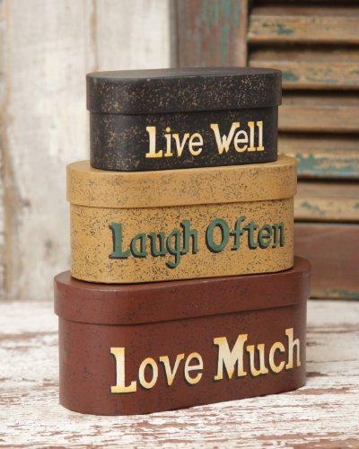 -. Binding : Kitchen -. Brand : Your Heart's Delight -. EAN : 0789322534355 -. Feature : Measures Stack: 9 1/4" H LG: 8" L x 3 1/2" W / Stylish decorative accent for any room decor / Great gift for family, friends, neighbors and acquaintances / With natural colors and texture to create a 3 dimensional piece come to life -. Label : Your Hearts Delight -. Manufacturer : Your Hearts Delight -. Model : 3B1225 -. MPN : 3B1225 -. PackageQuantity : 1 -. PartNumber : 3B1225 -. ProductGroup : Home -. ProductTypeName : HOME -. Publisher : Your Hearts Delight -. Studio : Your Hearts Delight -. Title : Your Hearts Delight 8 by 3-1/2-Inch Live Laugh Love Nesting Boxes, Large -. UPC : 840250024124