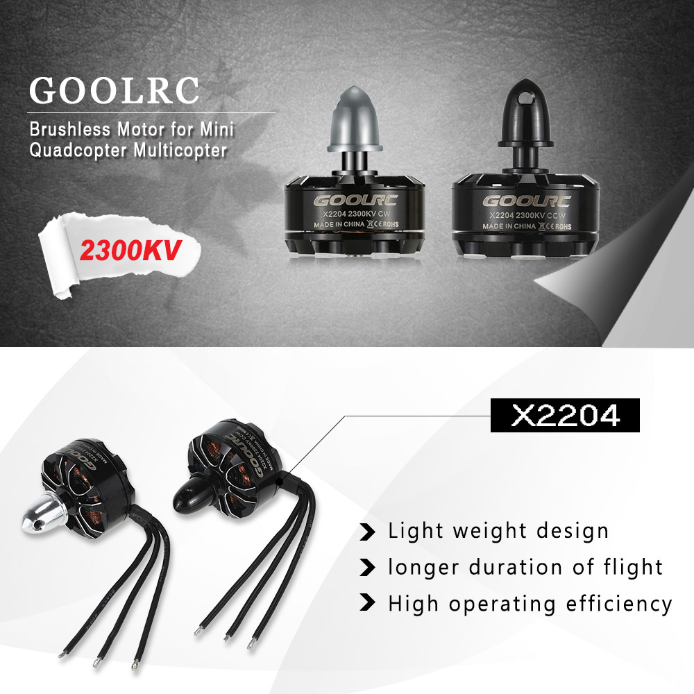 GoolRC X2204 2300KV CW/CCW brushless motor for QAV250 RC quadcopter. With CNC machined 6061 T6 billet aluminum heatsink can and high purity copper winding, it will maximizes the operating efficiency.