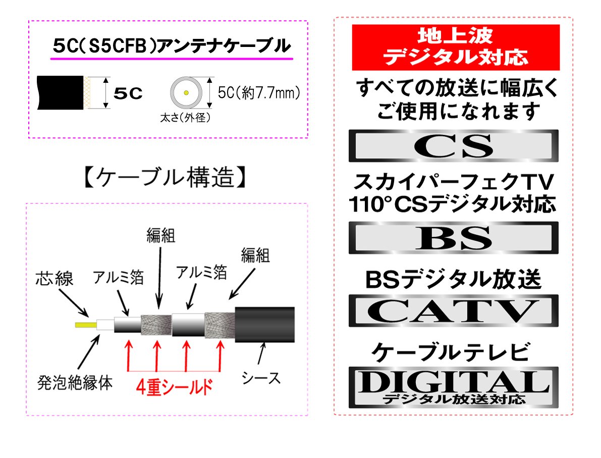 For antenna cable 5C * It is a thick core wire of S5CFB with low attenuation, suppresses the loss of radio waves, and furthermore blocks the external noise with the original 4-fold shield.