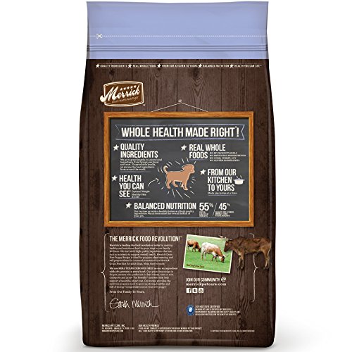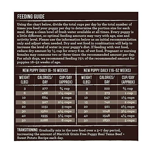 -. Binding : Misc. -. Brand : Merrick -. EAN : 0022808384564 -. Feature : HIGH PROTEIN: #1 ingredient is real deboned beef / GRAIN-FREE NUTRITION: Many pet parents choose grain-free for their pets to avoid grain sensitivities; improve gastrointestinal health; for easier digestibility; healthy skin and coat; and to foster increased energy. Merrick Grain-Free puppy food recipes contain no corn, wheat, soy or gluten ingredients. / PUPPY FORMULA: Merrick Grain Free puppy recipes contain DHA for healthy brain development and are formulated to meet the nutritional and development requirements of all puppies, including large and small breeds. / FROM OUR KITCHENS TO YOURS: Merrick Grain-Free puppy food is cooked in the USA in Merrick's own organically certified kitchens. Merrick Grain-Free recipes never include ingredients from China. -. Label : Merrick Pet Care -. Manufacturer : Merrick Pet Care -. Model : 38456 -. MPN : 38456 -. NumberOfItems : 1 -. PackageQuantity : 1 -. PartNumber : 38456 -. ProductGroup : Pet Products -. ProductTypeName : PET_SUPPLIES -. Publisher : Merrick Pet Care -. Size : 4 lb -. Studio : Merrick Pet Care -. Title : Merrick Grain Free Beef & Sweet Potato Dry Dog Food, 4 lbs. -. UPC : 022808384564
