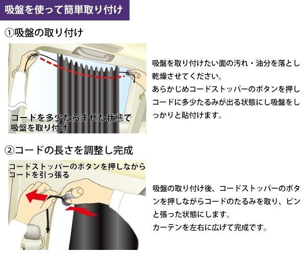 吸盤で簡単取り付け、専用フックで簡単取り付けの2WAY!ミニバンでも可能な横90×縦55cmのワイドサイズです。UVカット99%採用!用途に合わせて縦にロールアップすることが可能です。 |