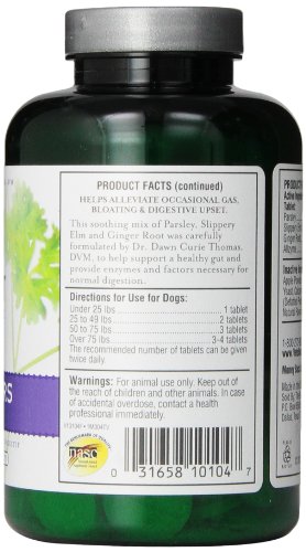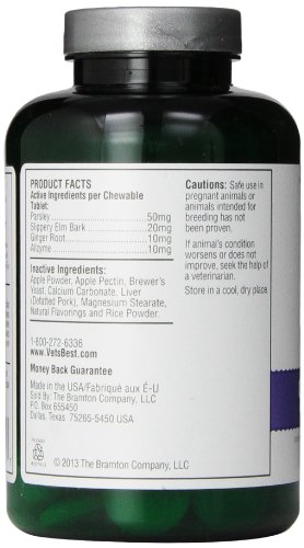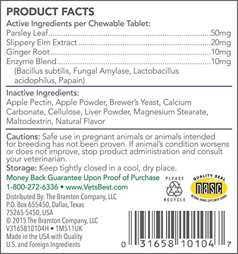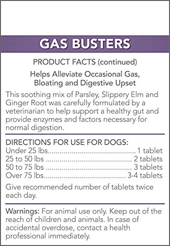 -. Feature : Vet's Best Gas Busters supplement for dogs (90 chewable tablets) helps with the discomfort of occassional gas, bloating, and upset digestive system / Digestive supplement for dogs uses key natural ingredients (parsley, slippery elm bark, ginger root) to help support a healthy gut / Contains Allzyme to provide your dog with enzymes that support healthy digestion / For mature dogs (both large breeds and small breeds); can be given twice daily (follow supplement directions) / Contains 90 chewable tablets; National Animal Supplement Council (NASC) Seal of Approval