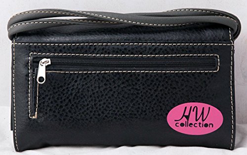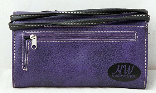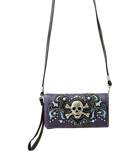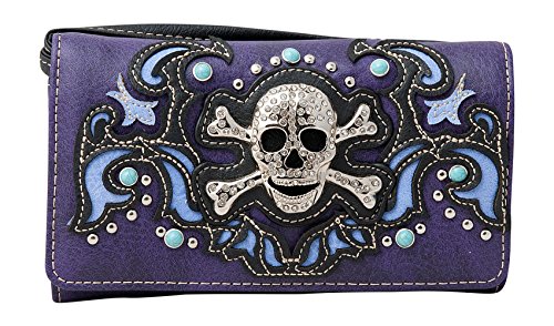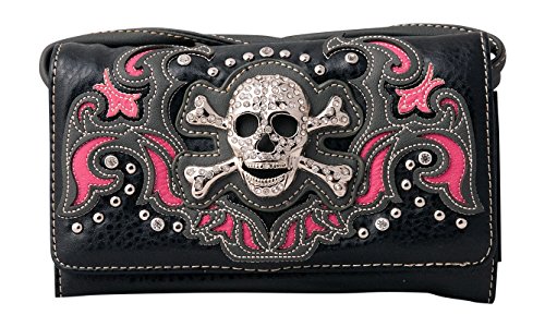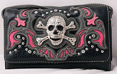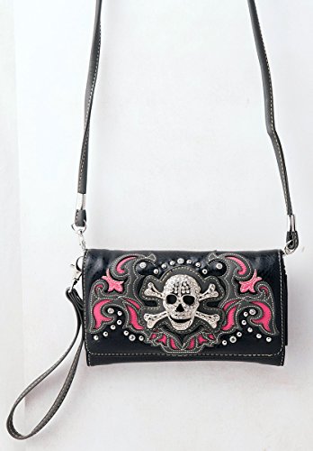 Product Description Western crossbody style wallet/wristlet/clutch is made from high quality premium faux/imitation PU leather decorated with silvertone studs, laser cut embroidery,and large eye-catching rhinestone silvertone skull. Single, removable strap to convert the trifold wallet into a wristlet and a single, long removable shoulder/crossbody strap. Snap closure. Flat currency compartments, expanding accordion area for coupons or receipts and a zippered pocket on the inside for coins. 9 slots on the inside for credit cards, ID, or business cards and 3 clear ID windows. Zippered and slide pocket on the back. 7.5 inches long X 1.5 inches wide X 4.5 inches tall. Aside from use as a wallet, it is great for occasions when you don't want to carry a big handbag and just want to bring the essentials so by using one of the straps you can be hands free! 0