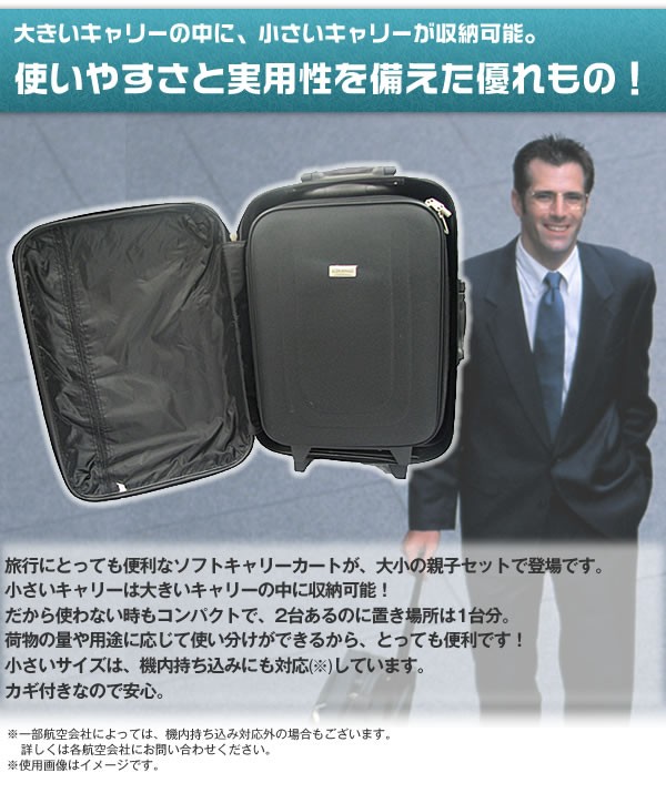 旅行にとっても便利なソフトキャリーカートが、大小の親子セットで登場です。小さいキャリーは大きいキャリーの中に収納可能!荷物の量や用途に応じて使い分け♪小は機内持ち込み対応。
