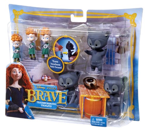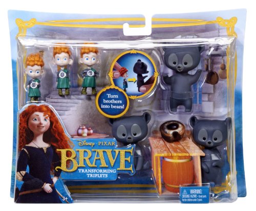 Disney/Pixar Brave Transforming Triplets Set: Inspired by the new hit Disney/Pixar animated film, Brave. In the upcoming Disney/Pixar movie Brave, Merida is a beautiful Scottish princess with triplet younger brothers. The Brave Transforming Triplets set captures the mischief of the three boys and their magical adventures. With unique poses that highlight the boys' playful personalities, plus the ability to transform the characters into adorable bear cubs, girls will delight in reenacting scenes that feature these charming brothers. Bears cannot stand alone.