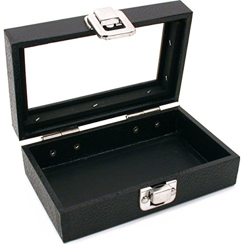 -. Feature : This is a new glass top black display tray case / This is great for keeping your items secure while traveling and easily displaying them / The glass top allows you to display your contents while keeping them dust free and secure / The latch on the lid help keep you from loosing any items / It measures approximately 6" x 3 3/4" x 2" (152 x 95 x 50 mm)