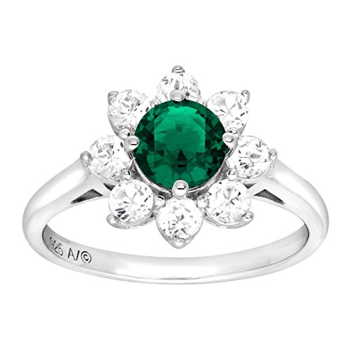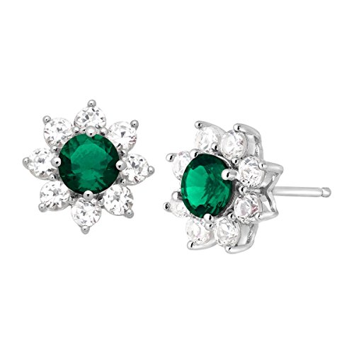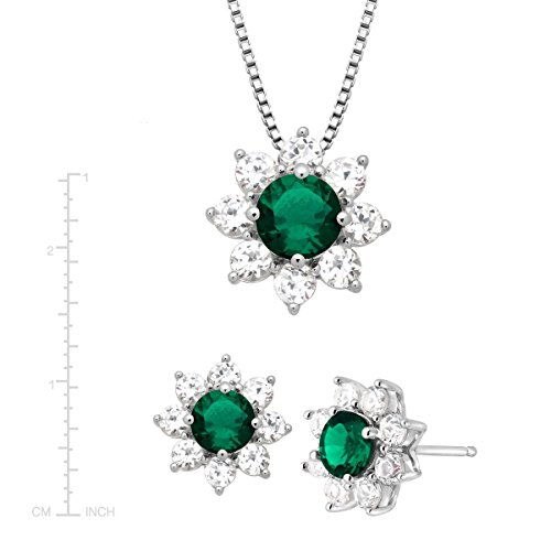 -. Feature : Stylized Flower Designs / 2 3/8 ct Round-Cut Created Emeralds / 3 1/2 Round-Cut White Sapphires / Sterling Silver / 18-Inch Box Chain