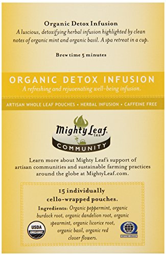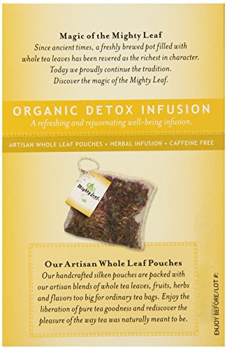 -. Binding : Grocery -. Brand : Mighty Leaf Tea -. EAN : 0656252300216 -. Feature : Delicious, artisan tea -. IsAdultProduct : 0 -. Label : Mighty Leaf Tea -. LegalDisclaimer : Actual product packaging and materials may contain more and different information than what is shown on our website. We recommend that you do not rely solely on the information presented and that you always read labels, warnings, and directions before using or consuming a product. Please see our full disclaimer below. -. Manufacturer : Mighty Leaf Tea -. Model : 656252300216 -. MPN : 656252300216 -. NumberOfItems : 1 -. PackageQuantity : 1 -. PartNumber : 656252300216 -. ProductGroup : Grocery -. ProductTypeName : GROCERY -. Publisher : Mighty Leaf Tea -. Size : 15 Biodegradable Whole Leaf Pouches -. Studio : Mighty Leaf Tea -. Title : Mighty Leaf Herbal Tea, Organic Detox Infusion, 15 Pouches -. UPC : 656252300216