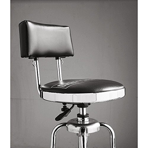 -. Brand : Craftsman -. Color : Black -. Feature : Durable, vinyl padded, adjustable backrest and seat for comfortable support / Seat back is adjustable from 9.6in to 11.2in for extra support / Hydraulic seat adjustable from 28.5in to 33in / Slip resistant, adjustable feet for leveling on uneven surfaces / High-polished, chrome finish -. PackageQuantity : 1 -. ProductGroup : Furniture -. ProductTypeName : HOME_FURNITURE_AND_DECOR -. Title : Craftsman Chrome and Vinyl Hydraulic Stool - Comfortable Swiveling Barstool for Home Bar Shop or Garage (Black)