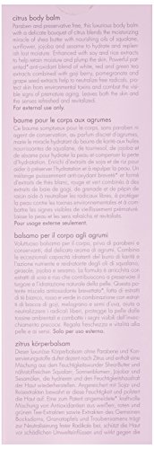 June Jacobs Citrus Body Balm restores suppleness and vitality to dull, rough and aging skin as it leaves behind a refreshing burst of aromatic citrus. Omega-rich jojoba, sunflower and sesame oils promote firmness and elasticity while botanical extracts of ginger and cucumber soothe inflammation. Grape polyphenols blend with green and white tea antioxidants to neutralize free radicals and repair environmental damage.Feature