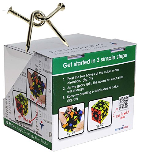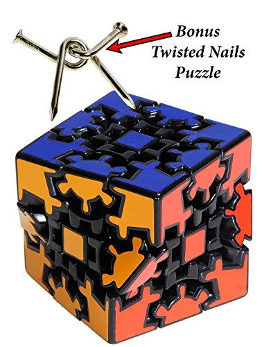 -. Binding : Toy -. Brand : Deluxe Games and Puzzles -. EAN : 0703546237045 -. Feature : Mix up the puzzle by twisting and turning left to right, up and down and side to side. / Objective is to return each side to a single color. (Similar to a Rubik's Cube) / Fascinating movements. Gears actually turn on the surface of the puzzle. / BONUS: Twisted Nails Puzzle. Separate and then rejoin the 2 carpenter's metal nails. / Measures approximately 2.25 inches cube. Smooth turning puzzle. -. Label : Deluxe Games & Puzzles -. Manufacturer : Deluxe Games & Puzzles -. MPN : RTY049149GC_BUN -. PartNumber : RTY049149GC_BUN -. ProductGroup : Toy -. ProductTypeName : TOYS_AND_GAMES -. Publisher : Deluxe Games & Puzzles -. Studio : Deluxe Games & Puzzles -. Title : Gear Cube Black _ Meffert's Exceptional Twisty Rotational Style Puzzle _ Bonus Twisted Nails Puzzle -. UPC : 703546237045
