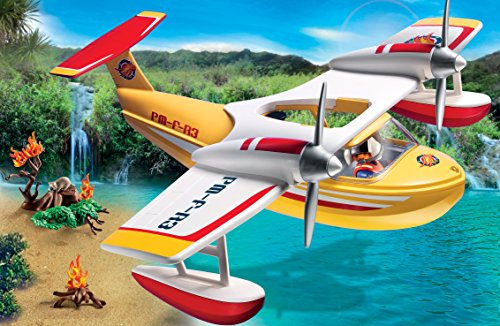 -. Feature : Soar over treetops and extinguish forest fires with the Firefighting Seaplane / Children can play with this set on its own, or combine with other PLAYMOBIL sets for hours of fun / Set includes one figure, plane, flaming trees, raccoon, and other accessories / Use the plane's central water tank to douse burning trees from above, simply push the pump in the back of the plane to release the water / Ages 4 and up