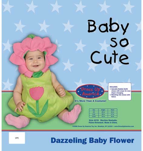 -. Binding : Toy -. Brand : Dress Up America -. Color : Multi -. Department : baby-girls -. Feature : Product comes complete with, bubble outfit and matching hat / Outfit closes with snaps for easy diaper, changing hat closes with velcro / Set packaged in durable snap-sealed poly bag -. Genre : Funny -. Label : Dress Up America -. Manufacturer : Dress Up America -. Model : 278 -. MPN : 278-12M -. NumberOfItems : 1 -. PackageQuantity : 1 -. PartNumber : 278-12M -. ProductGroup : Apparel -. ProductTypeName : BABY_COSTUME -. Publisher : Dress Up America -. Size : 6-12 Months -. Studio : Dress Up America -. Title : Dress Up America Dazzeling Baby Flower