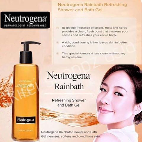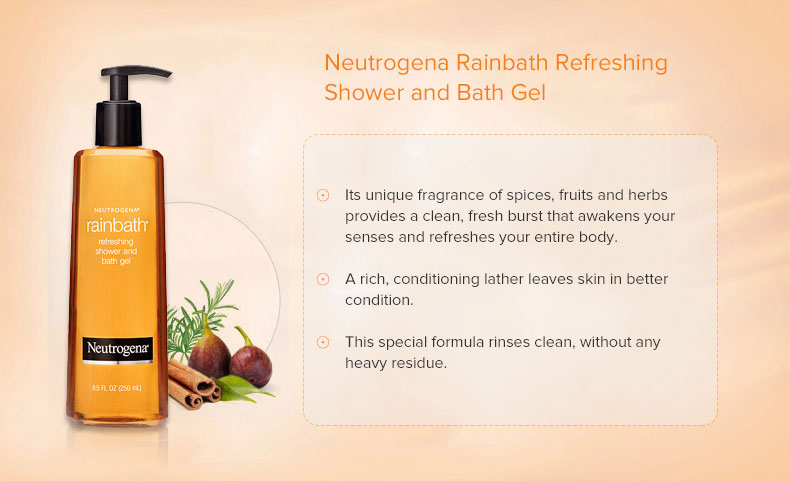 NEUTROGENA® Rainbath Shower and Bath Gel cleans, softens and conditions skin without a heavy leave-behind residue. Its unique fragrance of spices, fruits and herbs provides a clean burst that awakens your senses and refreshes your entire body. A rich, conditioning lather leaves skin in better condition feeling softer, smoother and renewed.