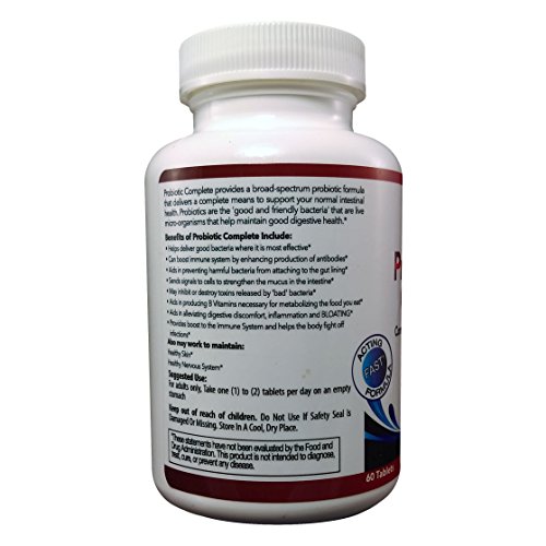 -. Feature : The BEST Probiotic available-- delivers a complete means to support your intestinal health. Probiotics are the 'good & friendly' bacteria that are live micro-organisms that maintain good digestive health. Aids in blocking unwanted bad bacteria, strengths the immune system and supports bowel regularity. / Probiotic Complete is key to supporting digestive health while boosting intestinal flora. / Probiotic Complete aids in digestion including bloating and gas. / Probiotic Compete aids in producing B Vitamins necessary for metabolizing the food you eat. / Made in the USA in a GMP & FDA Certified Lab for maximum effectiveness & potency. NO chemicals, preservatives, fillers or binders.