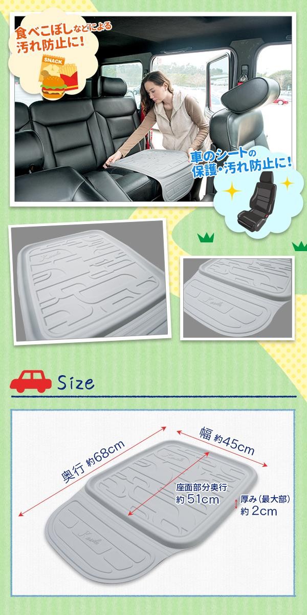 | カーシートプロテクターはチャイルドシート取付時のキズとずれを防ぎます。車のシートの保護に。食べこぼしなどによる汚れ防止にもなります。お手入れも簡単!! |