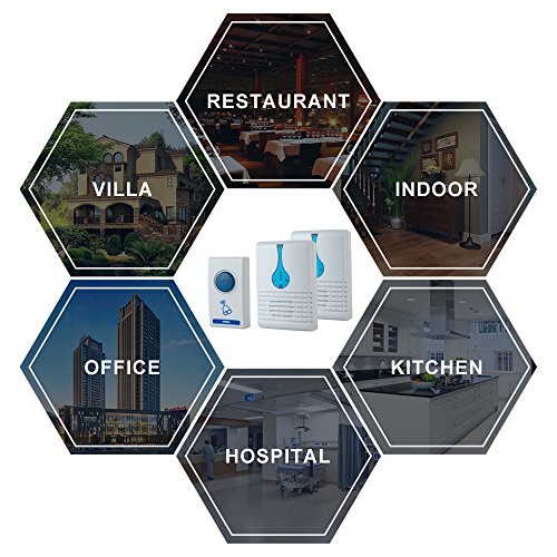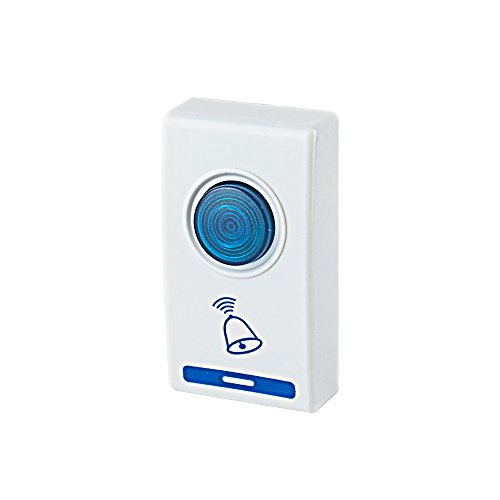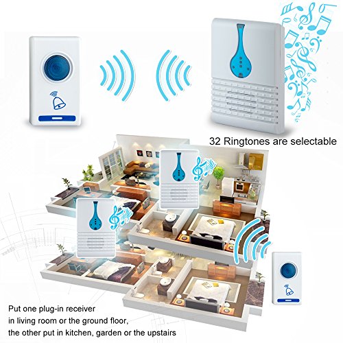 -. Feature : Color:White and blue,1 Push Button + 2 Battery Receiver,you can put the receiver in living room or kitchen ,upstairs or the garden / 12V 23A battery for the push button remote is INCLUDED / 32 pieces of selectable ring tones,up to 100m operation range (open air),it is loud enough that at highest setting you can hear it throughout the house.Never miss any visitors / Modern and stylish design, Low power consumption.Easy to install,screws and double-sided adhesive tapes are included / The Flashing light will be on when pressing button,giving you warning someone is waiting outside the door.Don't install this product in the sunny or rainy place