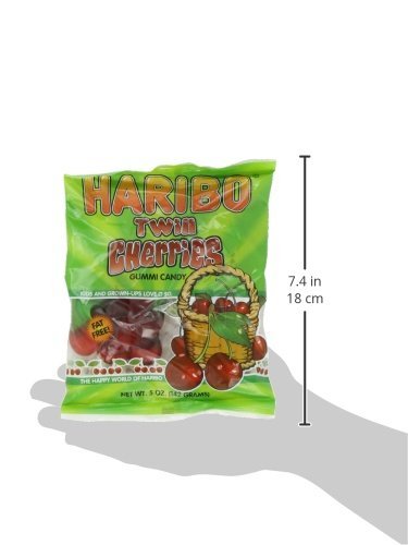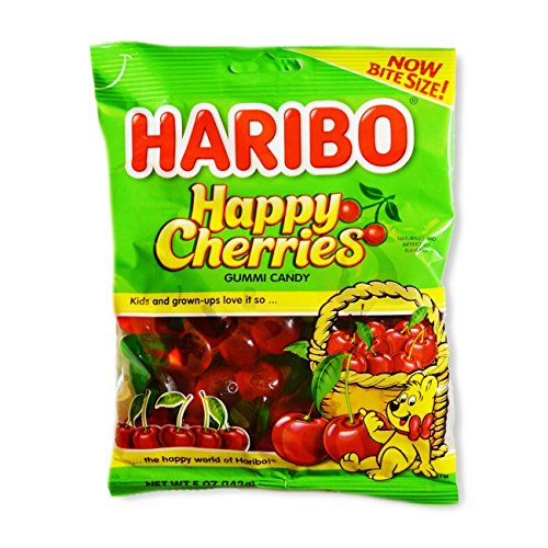 -. Binding : Misc. -. Brand : Happy Cherries -. EAN : 0728276317966 -. Feature : Top Notch Cherry Flavor and Thick Chewiness / Shaped and Flavored Like Cherries on a Stem / HARIBO has been making mouths happy, creating golden moments of joy and pleasure and adding color to our lives for over 90 years / The Happy World of Haribo / Fat Free! Gluten Free! -. IsAdultProduct : 0 -. Label : Haribo of America -. Manufacturer : Haribo of America -. PackageQuantity : 12 -. ProductGroup : Grocery -. ProductTypeName : GROCERY -. Publisher : Haribo of America -. Size : 5 Ounces -. Studio : Haribo of America -. Title : Haribo of America Gummi Candy, Happy Cherries, 12 Bags x 5 Oz -. UPC : 728276317966