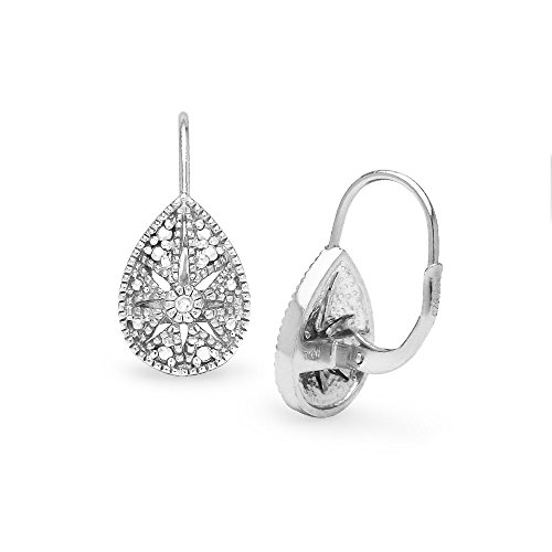 Pear shape drop earrings present two small 1.3 diamonds set in a sterling silver starburst design. The earrings feature leverback closures.