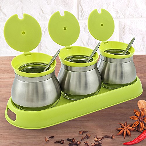 June Sky Sugar Bowl with Lid and Sugar Spoon, Best Condiment jar Container Cruet for Your Home and Kitchen - Made of Clear Glass, Stainless Steel and Plastic. Green (pack of 3)