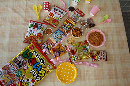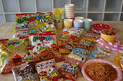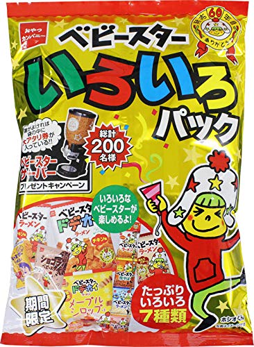原材料:<ベビースターラーメン むかしチキン>小麦粉(国内製造)、植物油脂、しょうゆ、砂糖、食塩、チキンエキス、たんぱく加水分解物、ミート調味エキス、ミート調味パウダー、酵母エキスパウダー/調味料(アミノ酸等)、炭酸Ca、酸化防止剤(ビタミンE)、(一部に小麦・大豆・鶏肉・豚肉・ゼラチンを含む)<ベビースターラーメン ほたてバター味ミニ>小麦粉(国内製造)、植物油脂、ほたてバター風味パウダー(グラニュー糖、食塩、粉末しょうゆ、たんぱく加水分解物、デキストリン、チーズパウダー、ホタテエキスパウダー、バターパウダー)、食塩、砂糖、ミート調味エキス、たんぱく加水分解物、しょうゆ/調味料(アミノ酸等)、香料、乳化剤、甘味料(ステビア、スクラロース、カンゾウ)、酸化防止剤(ビタミンE)、(一部に乳成分・小麦・大豆・鶏肉・豚肉・ゼラチンを含む)<ショコラベビースター>小麦粉(国内製造)、植物油脂、砂糖、準チョコレート、粉末卵、ココアパウダー、加工黒糖、クリーム加工品、食塩/加工デンプン、香料、乳化剤、酸化防止剤(ビタミンE)、(一部に卵・乳成分・小麦・大豆を含む)<ベビースタードデカイラーメン チキン味>小麦粉(国内製造)、植物油脂、しょうゆ、砂糖、チキンエキス、食塩、粉末卵、たんぱく加水分解物、ミート調味エキス、ミート調味パウダー、野菜エキス、魚介エキス、チキンエキスパウダー/加工デンプン、調味料(アミノ酸等)、酸化防止剤(ビタミンE)、香料、(一部に卵・小麦・大豆・鶏肉・豚肉・ゼラチンを含む)<ベビースタードデカイラーメン メープルシロップ味>小麦粉(国内製造)、植物油脂、ケーキドーナツミックス(小麦粉、砂糖、その他)、メープルシロップ風味パウダー、砂糖、チーズパウダー、粉末油脂、食塩、メープルシロップ加工品(カナダケベック州産メープルシロップ33%)、粉末卵/加工デンプン、香料、ベーキングパウダー、乳化剤、カラメル色素、甘味料(ステビア)、酸化防止剤(ビタミンE)、(一部に卵・乳成分・小麦・大豆を含む)<ベビースターラーメン チキン味>小麦粉(国内製造)、植物油脂、しょうゆ、砂糖、食塩、チキンエキス、たんぱく加水分解物、ミート調味エキス、ミート調味パウダー、酵母エキスパウダー/加工デンプン、調味料(アミノ酸等)、酸化防止剤(ビタミンE)、(一部に小麦・大豆・鶏肉・豚肉・ゼラチンを含む)<ベビースターいろいろ4連><チキン>小麦粉(国内製造)、植物油脂、しょうゆ、砂糖、食塩、チキンエキス、たんぱく加水分解物、ミート調味エキス、ミート調味パウダー、酵母エキスパウダー/加工デンプン、調味料(アミノ酸等)、酸化防止剤(ビタミンE)、(一部に小麦・大豆・鶏肉・豚肉・ゼラチンを含む)<焼そば>小麦粉(国内製造)、植物油脂、ソース(砂糖、野菜・果実、醸造酢、食塩、アミノ酸液、その他)、でん粉、砂糖、食塩、香辛料、アオサ粉、野菜パウダー、ミート調味エキス、ソース風味パウダー、野菜エキス、魚介エキス、魚醤(魚介類)/加工デンプン、調味料(アミノ酸等)、香料、カラメル色素、乳化剤、酸味料、酸化防止剤(ビタミンE)、甘味料(ステビア)、香辛料抽出物、(一部に卵・乳成分・小麦・魚醤(魚介類)・牛肉・さば・大豆・鶏肉・豚肉・もも・りんごを含む)<うましお>小麦粉(国内製造)、植物油脂、うましお風味パウダー(たんぱく加水分解物、ぶどう糖、食塩、チキンエキスパウダー、野菜パウダー、酵母エキスパウダー、砂糖、乳糖、香辛料、調味油)、アサリエキス、食塩、チキンエキス、たんぱく加水分解物、香辛料/調味料(アミノ酸等)、乳化剤、カラメル色素、酸化防止剤(ビタミンE)、酸味料、香料、(一部に乳成分・小麦・ごま・大豆・鶏肉・豚肉・ゼラチンを含む)<揚げそば>小麦粉(国内製造)、植物油脂、しょうゆ、砂糖、食塩、チキンエキス、たんぱく加水分解物、ミート調味エキス、ミート調味パウダー、酵母エキスパウダー/調味料(アミノ酸等)、酸化防止剤(ビタミンE)、(一部に小麦・大豆・鶏肉・豚肉・ゼラチンを含む)※本製品製造施設では、卵、乳、そば、落花生、えび、かにを含む製品を製造しています。