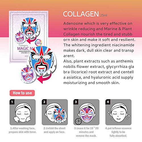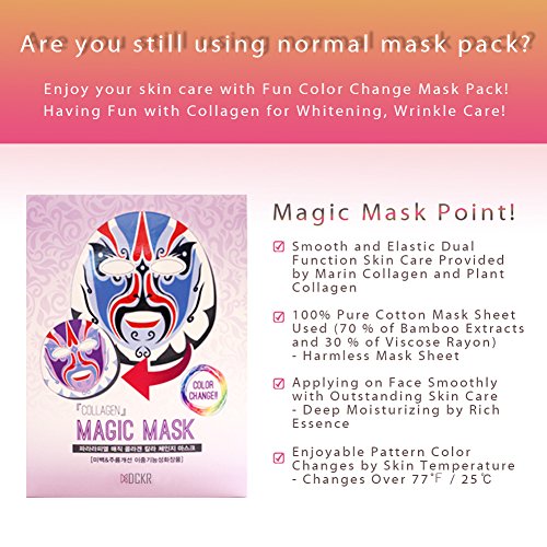 -. Feature : Smooth and Elastic Dual Function Skin Care Provided by Marine Collagen and Plant Collagen / Deep Moisturizing by Rich Essence - Applying on Face Smoothly with Outstanding Skin Care / Harmless Mask Sheet - 100% Pure Cotton Mask Sheet (70% of Bamboo Extracts and 30% of Viscose Rayon) / Enjoyable Pattern Color Changes by Skin Temperature - Changes Over 77℉ / 25℃ / Made in Korea - Collagen magic mask 1set (10pcs x 25ml)