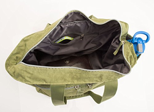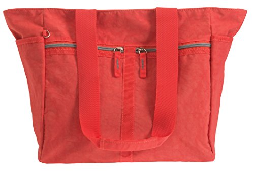 -. Feature : Ultra light, 7 compartment, crinkled nylon totes pack flat for travel / 3 spacious zip compartments - 1 inside and 2 outside / 2 side compartments hold bottles and travel umbrellas / Full width deep back compartment with hook and loop closure / Measures 17.5 wide, 4" deep and 11" high, 2 webbed straps with 12" drop