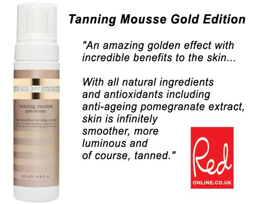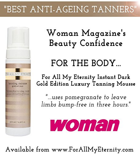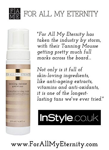 Luxury UK beauty brand For All My Eternity offer you their best-selling Gold Edition Instant Dark Tanning Mousse 6.8fl oz - an even more refined version of their original Tanning Mousse formula that has scored rave reviews and 5-star ratings from the UK beauty industry - now with no added fragrance and loaded with even more anti-oxidants and new natural anti-ageing ingredients to offer an even more luxurious and longer-lasting tanning experience than ever before. For All My Eternity Gold Edition Tanning Mousse has been developed and tested by top industry professionals to achieve self tan perfection. Featuring a carefully selected blend of anti-ageing ingredients including pomegranate extract, natural anti-oxidants, moisturizers and EHA - a natural agent that tans a deeper layer of the skin for a more realistic and longer-lasting tan that fades evenly - this premium Gold Edition self tanning mousse works with all skin tones to deliver an instant, flawless, natural looking dark tan that now lasts even longer and cares even more for your skin. For All My Eternity Tanning Mousse Gold Edition is one of the easiest to apply self tan products on the market - especially when applied with a Tanning Mitt - gliding on effortlessly without any rubbing or streaking to match your natural skin tones, absorbing instantly to the touch, and is perfect for both expert tanners and those who are trying out self-tanning for their first-time.Feature