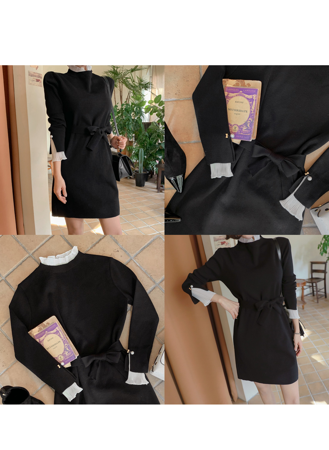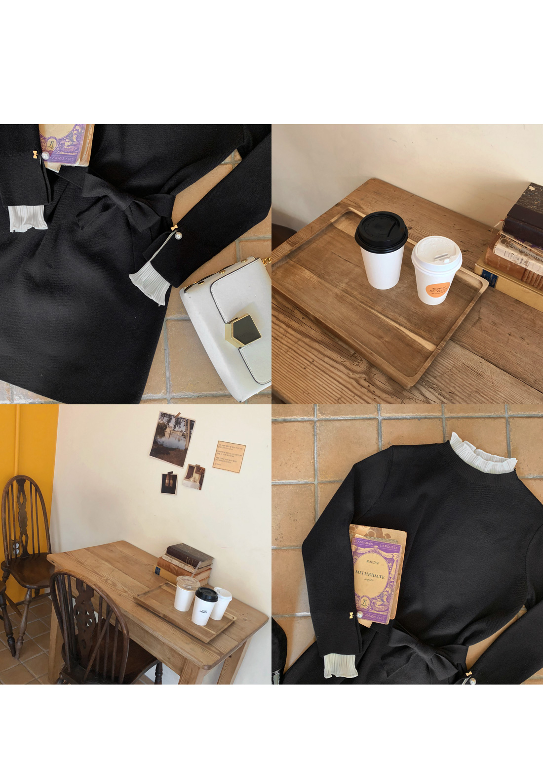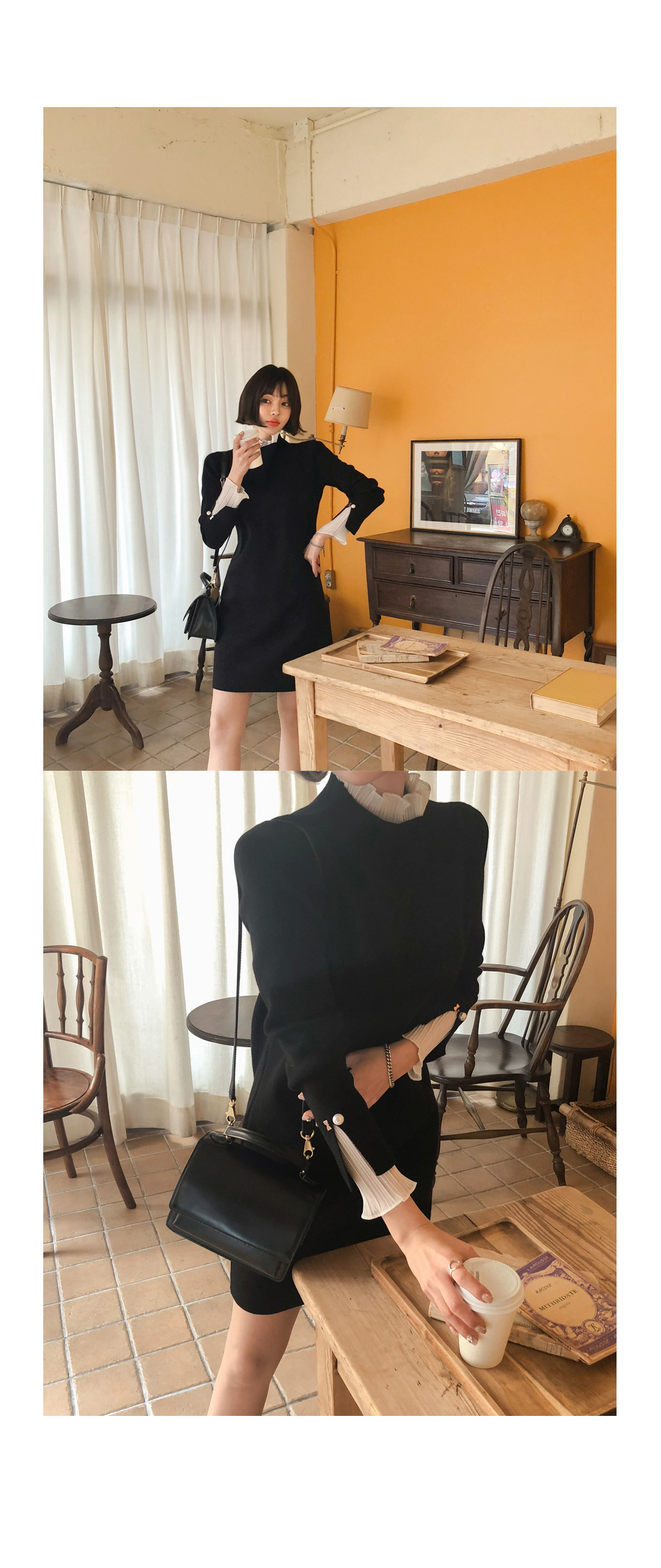 네크 라인과 소매 밑단에 배색 프릴 디테일을 주어