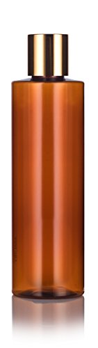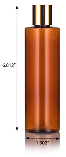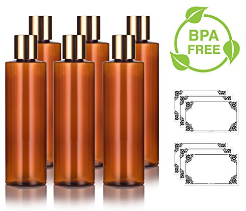 Amber PET Plastic (BPA Free) Refillable Cylinder Round Bottle with Gold Disc Cap - 8 oz (6 pack) + Labels