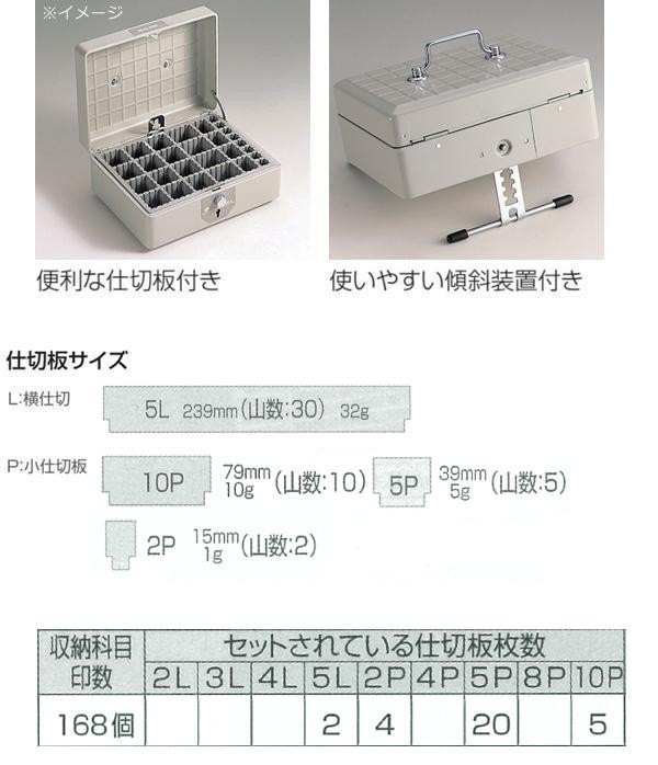 fk094igrjsタテ・ヨコの自由自在な仕切板付きで、むだなくきれいに収納できます。出し入れがしやすく、作業効率が向上する傾斜装置が付いています。 サイズ W262×D188×H96mm(内寸:W234×D154×H75mm) 個装サイズ:27×22×11cm 重量 1096g 個装重量:1200g 付属品 鍵2本 製造国 日本 スチール製の丈夫な印箱。 タテ・ヨコの自由自在な仕切板付きで、むだなくきれいに収納できます。出し入れがしやすく、作業効率が向上する傾斜装置が付いています。