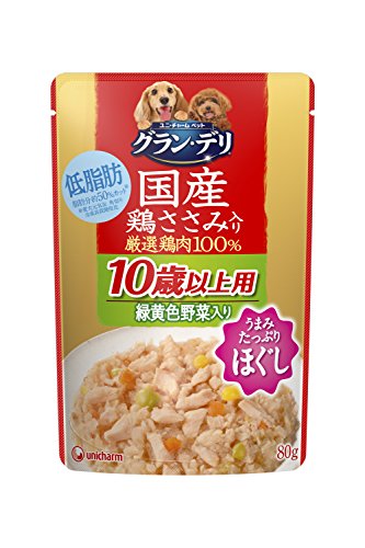 原材料:肉類(鶏胸肉、鶏ミンチ、鶏ササミ)、野菜類(ニンジン、グリンピース、トウモロコシ)、しょうゆ、増粘多糖類、塩化カリウム、酸化防止剤(EDTA-Ca・Na)、ビタミン類(B1、B2、B6、B12、E)