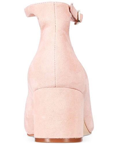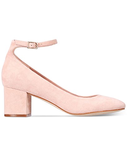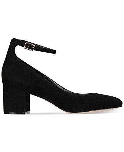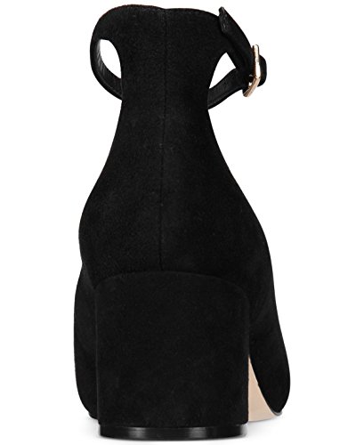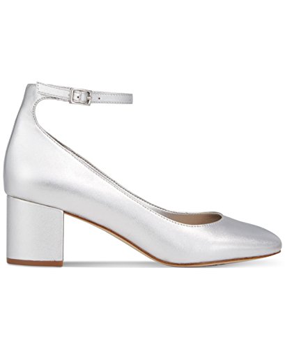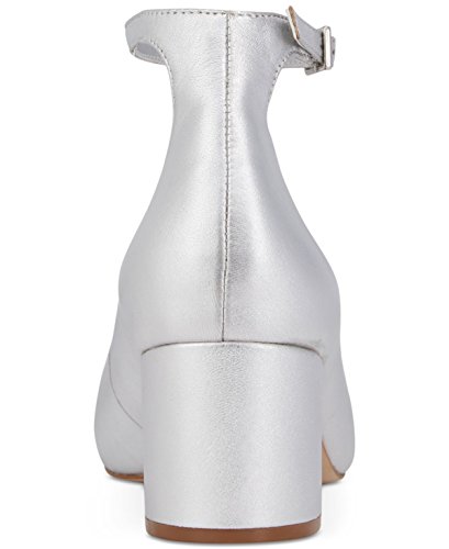 -. Feature : Almond-toe pumps with ankle strap and buckle closure / 2" covered block heel / Suede upper; silver: leather upper; manmade sole / Imported