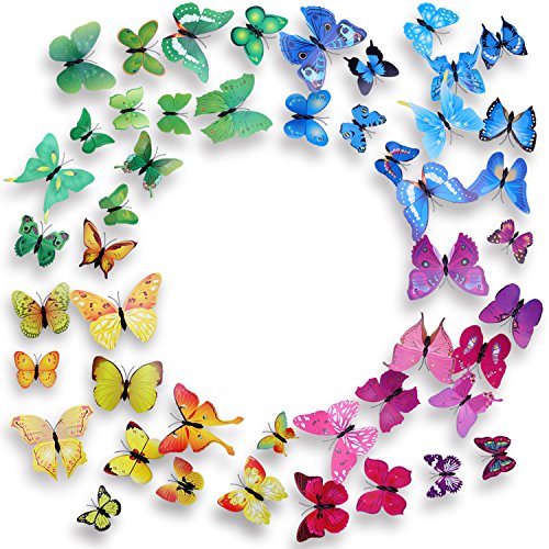 -. Feature : Package Including: 12 pieces blue butterfly stickers, 12 pieces purple butterfly stickers, 12 pieces green butterfly stickers, 12 pieces yellow butterfly stickers and 4 sheet of Dot Glue. / Good Quality: Non-toxic, Great apply to dry, clean, and smooth surfaces. / 3D Butterfly sticker have 4 color and different size, with glue dots to help attaching to the wall, also with Magnet. great to art decorations. / Easy to Apply: Beatiful and Colorful design, Removable, Durable, Moisture Resistance. / Suitable for a wide range of decorate your home, use them on fridges as there is a magnet, or stick to wall or door or window ect.