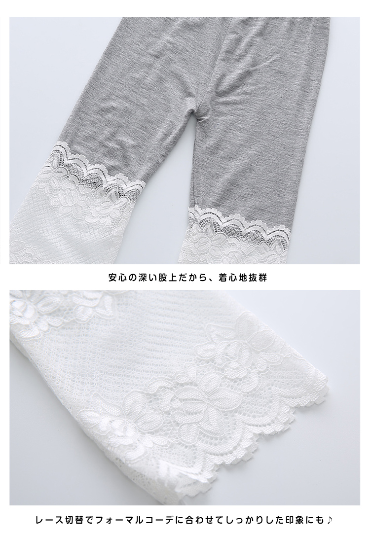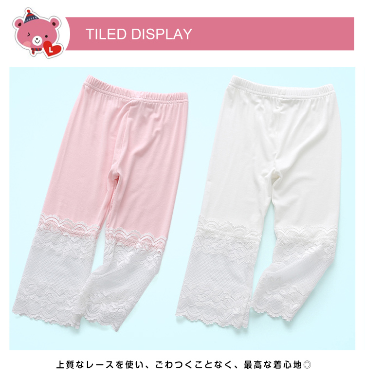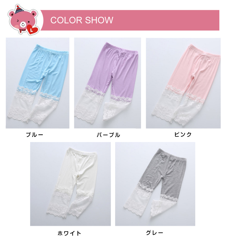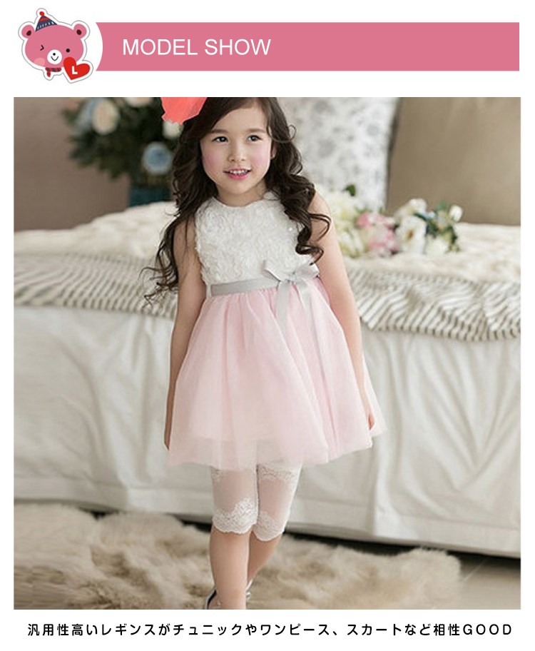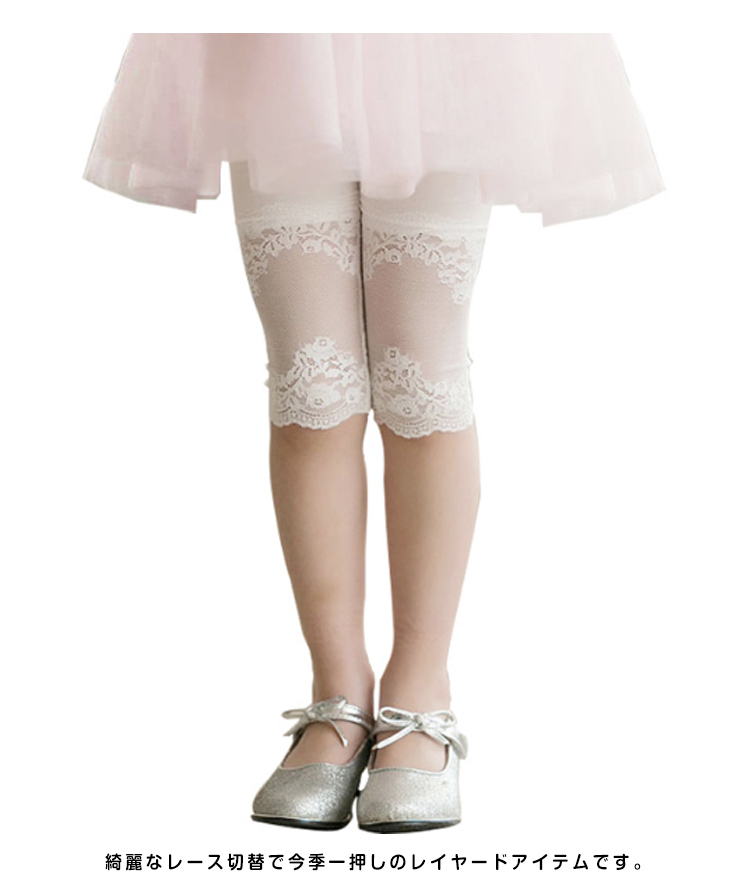 | 可愛いレース切替子供スパッツ汎用性高いレギンスがチュニックやワンピース、スカートなど相性GOOD綺麗なレース切替で今季一押しのレイヤードアイテムです。上質なレースを使い、ごわつくことなく、最高な着心地◎シースルーレース切替でカジュアルにもフォーマルにも合わせるアイテム次第、いろんななシーンに着用いただけるオールマイティーが嬉しい | |