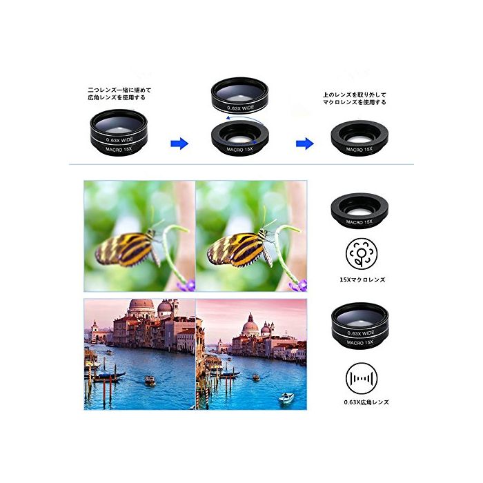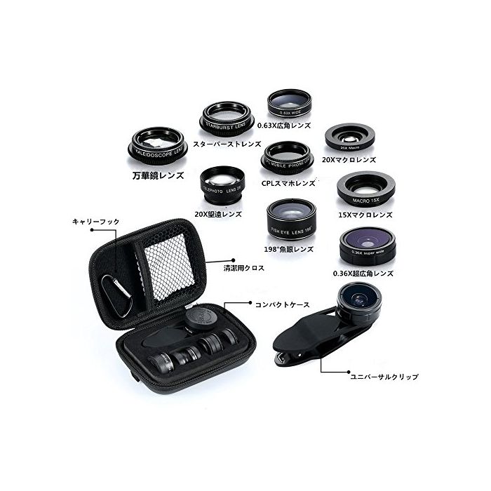 원본상품명: 9in1 高品質スマトフォン用カメラレンズ Knguvth正規品 ズムレンズキット 2X望遠レンズ 198°魚眼レンズ 0.36X超角レンズ 0.63xワイドレンズ マクロレンズ20 x 15X