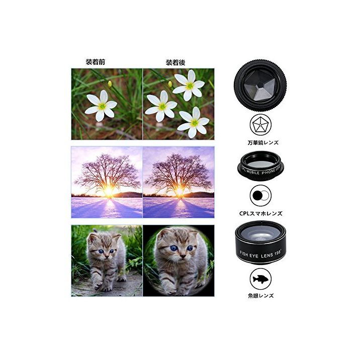 【198°어안렌즈】:198°의 화뿔!구면과 같은 일그러짐이 재미있는 어안렌즈!현장감이 개미,독특한 촬영이 간단하게 즐길 수 있도록(듯이) 됩니다.【0.63X광각 렌즈0.36X초 광각 렌즈】광대한 풍경 사진에,실내를 널리 사하고 싶을 때에,대인원수 에서의 기념 사진에 최적!【20 x매크로 렌즈15 x매크로 렌즈】대부분 세부까지 잘 보입니다.피사체에 빠듯이까지 접근하는 것이 요령입니다.