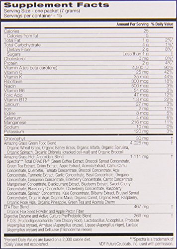 This powerful blend thoughtfully combines our alkalizing farm fresh greens and wholesome fruits and veggies plus an anitoxidant blend packed with 15,000 ORAC units per serving to help you feel amazing every day. At Amazing Grass our roots run deep...Back to our family farm in Kansas, where for over 3 generations Amazing Grass has organically grown & harvested the most nutrient-dense greens on earth. Today, we thoughtfully craft our greens with the highest quality, plant-based ingredients curated from like-minded farmers from around the world. Amazing Grass products are a delicious way to nourish your body with the whole food nutrition it needs to feel amazing every day.Feature