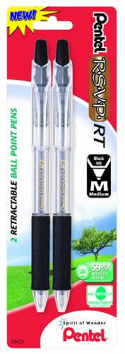 Pentel R.S.V.P. RT New Retractable Ballpoint Pen, Medium Line, Black Ink, 2 Pack (BK93BP2A)