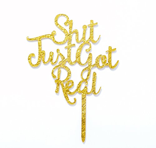 - Size: Approx. 6.9-inch Height x 5.1-inch Width. Package Includes: 1 Gold Shit Just Got Real Cake Topper.