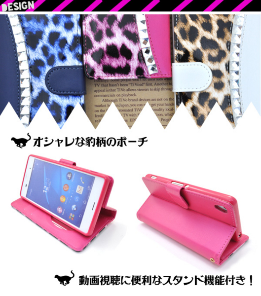 Xperia Z3用の豹柄プリントがオシャレな手帳型ケースです。